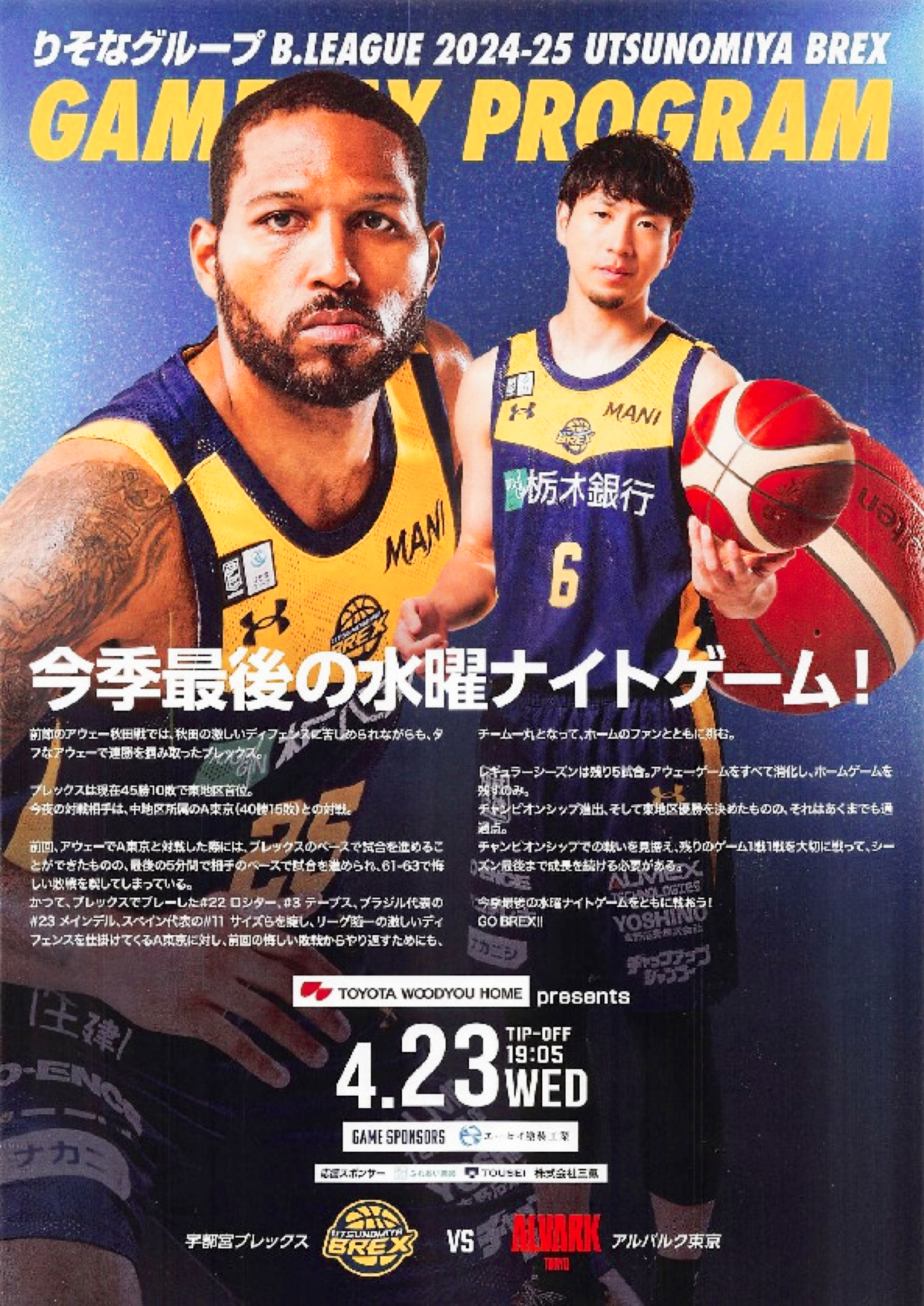 B.LEAGUE 2024-2025シーズン 第34節 アルバルク東京戦 2025 4/23 BREX この日はBREXの底力が見られました。終始劣勢から最後は力勝負で挑み勝利を勝ち取り…ただ激しい試合で怪我が心配だし、いまピークではなく、ピークはチャンピオンシップに持っていって貰いたいものです。 プログラム 試合前 前半 ハーフタイム(BREX.EXE) 後半 試合後のインタビュー BREX B.LEAGUE 2024-2025シーズン 第31節 京都ハンナリーズ戦 B.LEAGUE 2024-2025シーズン 第35節 群馬クレインサンダーズ戦 関連記事 B.LEAGUE 2025-2026シーズン 第12節 秋田ノーザンハピネッツ戦 2025年12月7日 B.LEAGUE 2025-2026シーズン 第11節 千葉ジェッツ戦 2025年11月16日 B.LEAGUE 2025-2026シーズン 第8節 横浜ビー・コルセアーズ戦 2025年11月5日 B.LEAGUE 2025-2026シーズン 第7節 FE名古屋戦 2025年11月2日 B.LEAGUE 2025-2026シーズン 第5節 滋賀レイクス戦 2025年10月26日 東アジアスーパーリーグ2025-26 vs ソウルSKナイツ戦 2025年10月22日 B.LEAGUE 2025-2026シーズン 第3節 千葉ジェッツ戦 2025年10月15日 B.LEAGUE 2025-2026シーズン 第2節 島根スサノオマジック戦 2025年10月12日