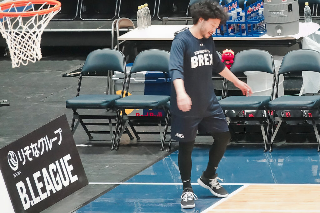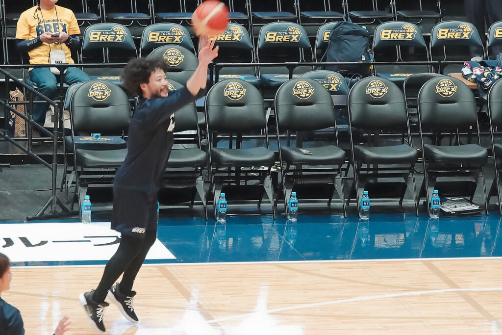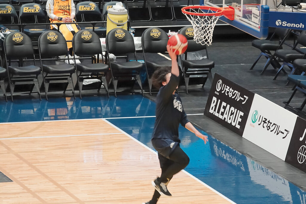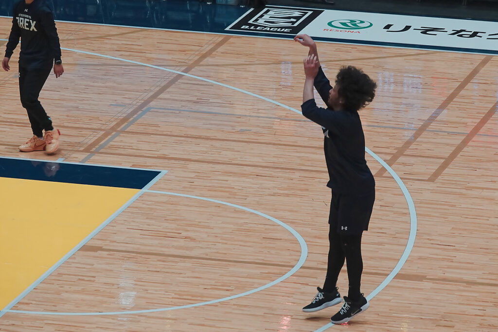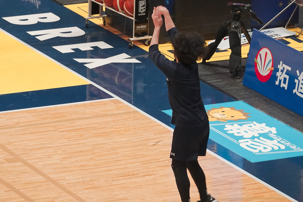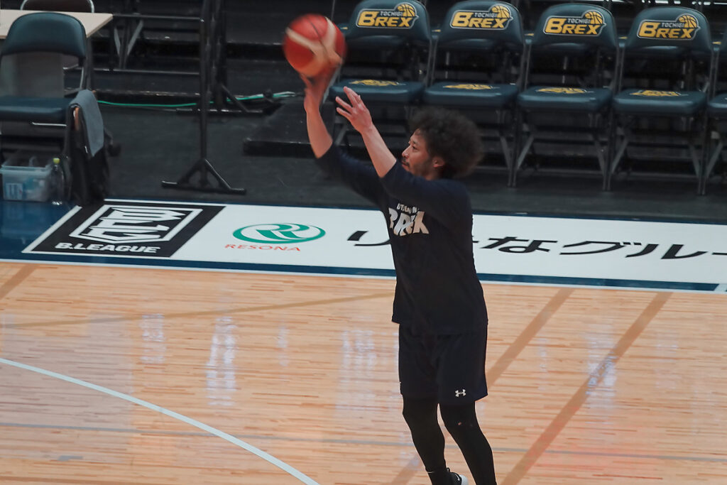試合開始2時間くらい前ですが、いつもはジェレットがシュート練習をしているのですが、この日は田臥キャプテンが黙々と練習していました。