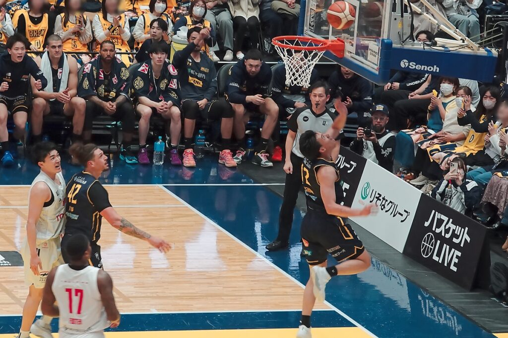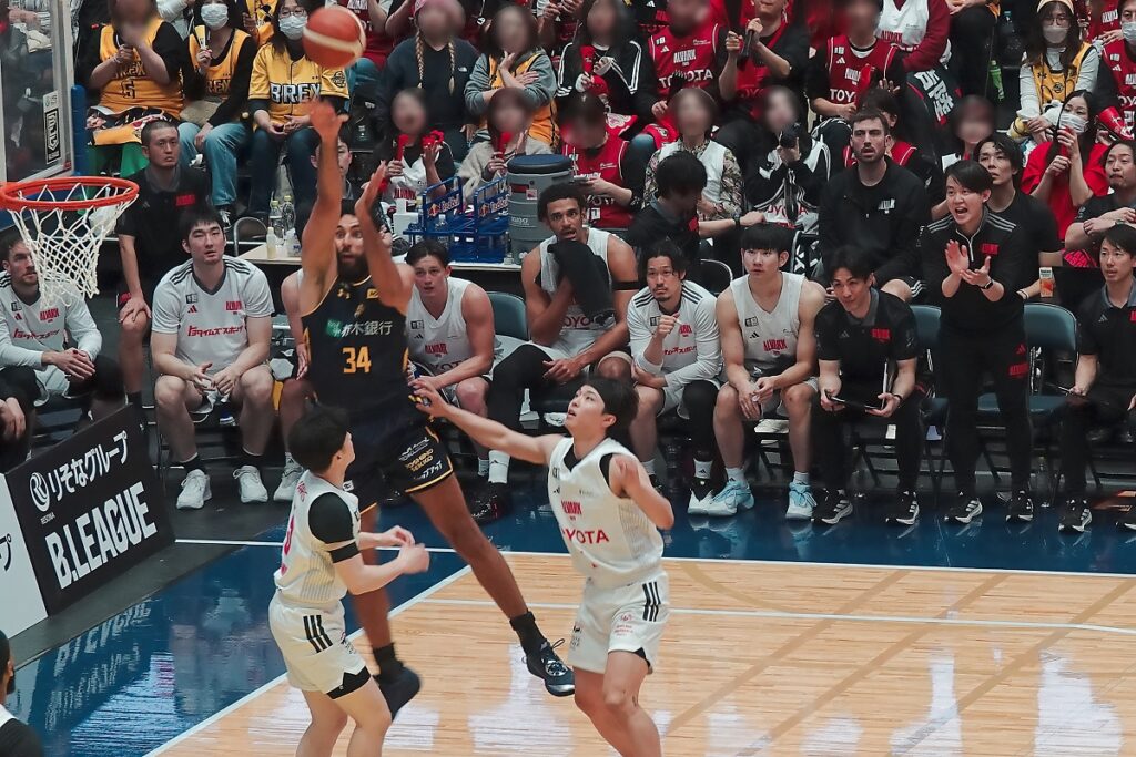 第3Q出だしで14点差を付けられていましたが、その後一時は逆転したものの、最後は残り7.9秒でブレックスのポゼッションでしたが、ニュービルがボールを失い、最後はこの日復帰したライアンに決められました。