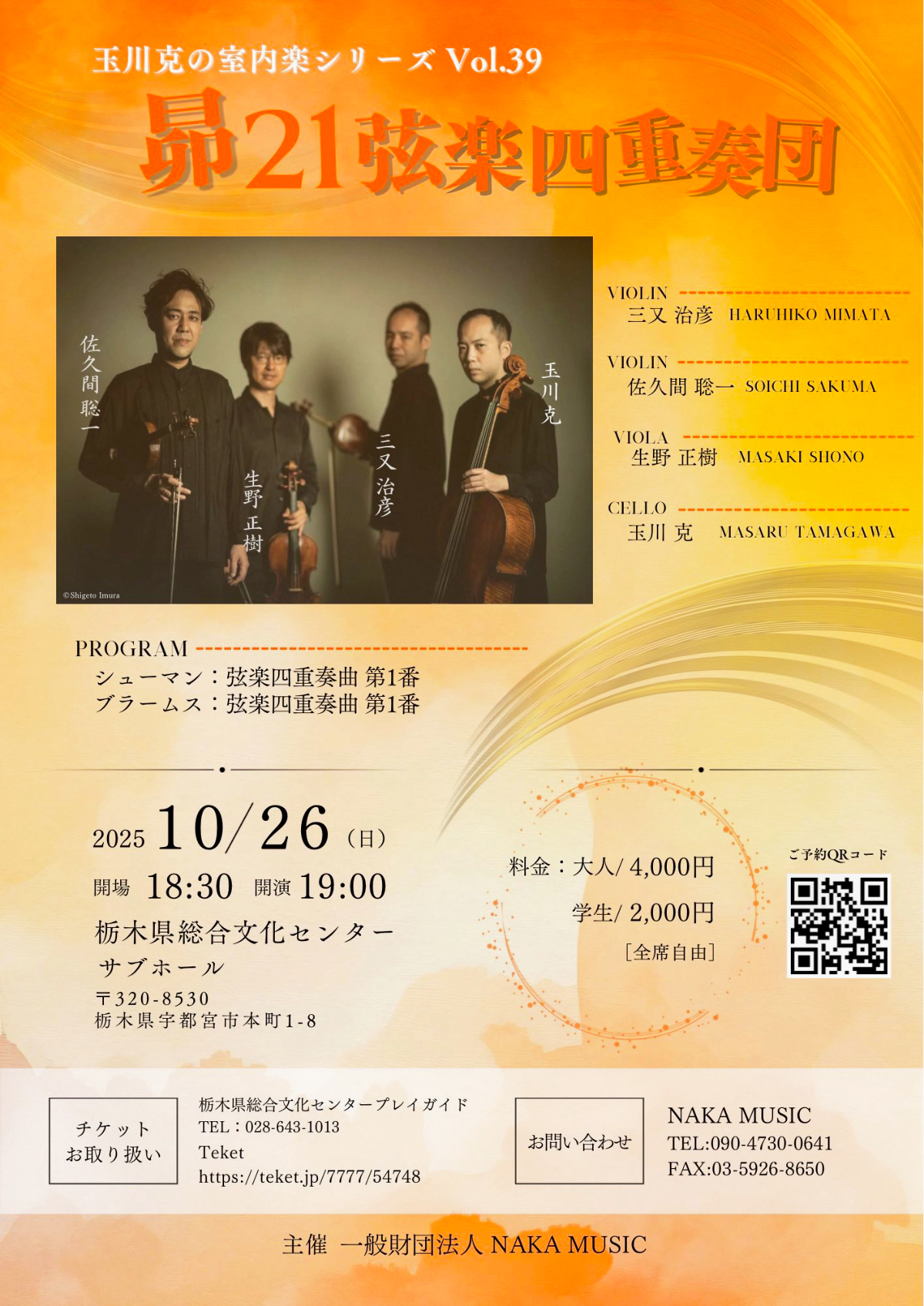 - ブラームス:弦楽四重奏曲 第一番(1st Vn.:三又治彦)